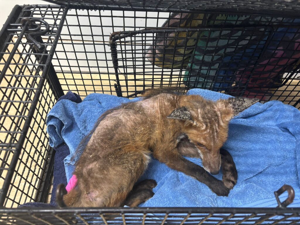 Back at their Casualty Centre, the fox — later named “Dobby” (after the much-loved character from the Harry Potter films) — was triaged, given initial medication, and settled for the night. He was underweight, dehydrated, and suffering from extensive mange, with bald, crusted skin.